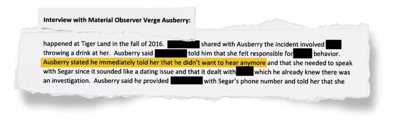 Ausberry also was reported to a deputy Title IX coordinator for screaming at a female employee in the athletic department, but was never investigated, Husch Blackwell found. Ausberry tried to downplay the complaint, saying his relationship with the woman was like “brother-sister” and “lovehate.”