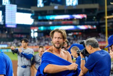 PHOENIX — Clayton Kershaw, his shirt off, cap on his head, ...